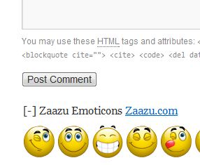 Instalasinya mudah, setelah download plugin custom emoticon-nya, tinggal diupload ddari dashboard WordPress->plugin, dan aktifkan. WordPress comment anda sudah menggunakan custom emoticon, lihat dibawah tombol post comment disitu ada tulisan ‘Zaazu Emoticons’ tinggal di klik dan pilih deh mau menggunakan custom emoticon yang mana.